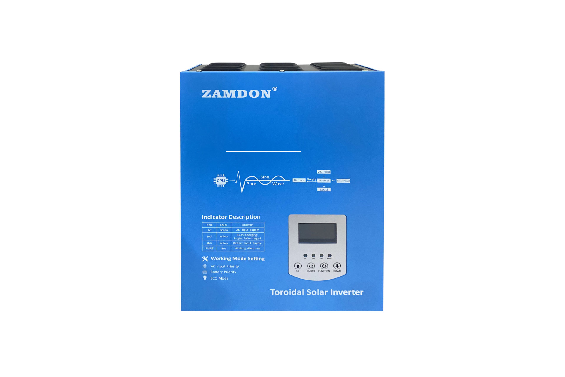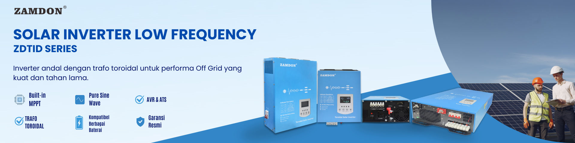 Dilengkapi trafo toroidal, konsumsi idle rendah, dan menghasilkan pure sine wave stabil dengan AVR bawaan, aman untuk semua perangkat. Mendukung baterai asam timbal maupun lithium, dilengkapi MPPT controller, serta berbagai mode kerja (AC Priority / ECO / Battery Priority).