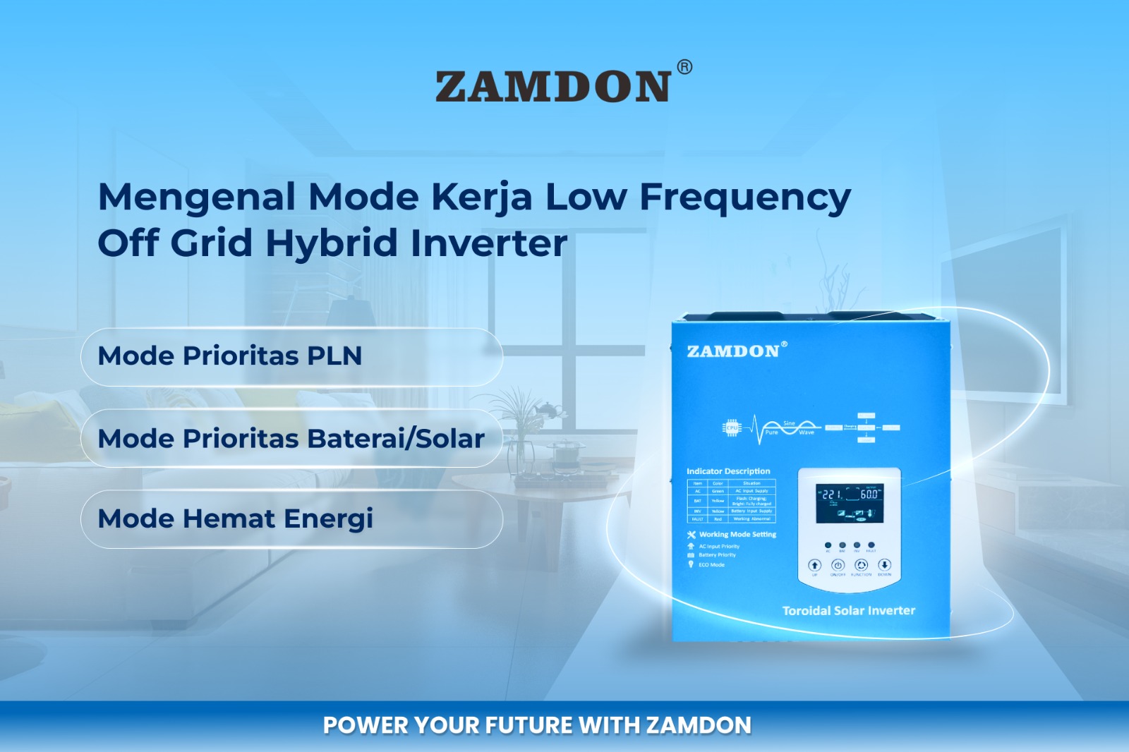 Inverter Zamdon memiliki tiga mode kerja utama, yaitu Mains Priority Mode, Battery (Solar) Priority Mode, dan Energy Saving Mode. Ketiga mode ini dirancang untuk memberikan kestabilan listrik, efisiensi energi, serta perlindungan optimal bagi baterai dan peralatan listrik.
