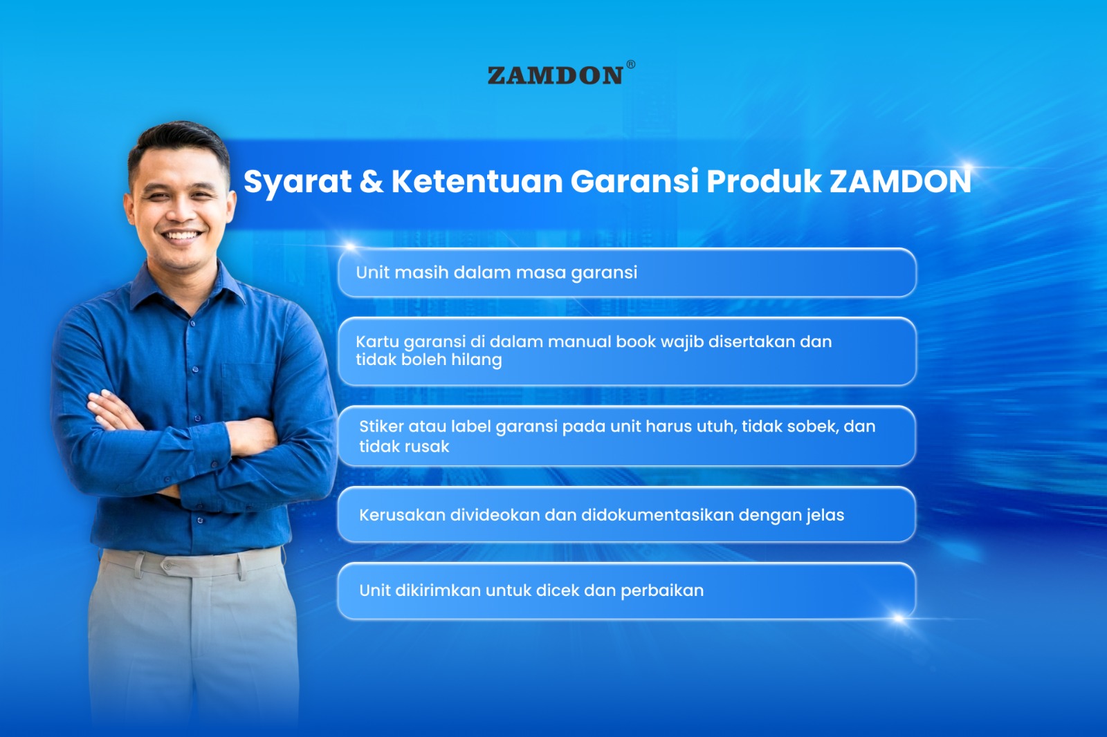 Zamdon Power berkomitmen memberikan layanan purna jual yang profesional melalui sistem garansi resmi dan prosedur teknis yang terstandar. Setiap produk dirancang dan diproses untuk memastikan performa yang andal serta keamanan penggunaan dalam jangka panjang.